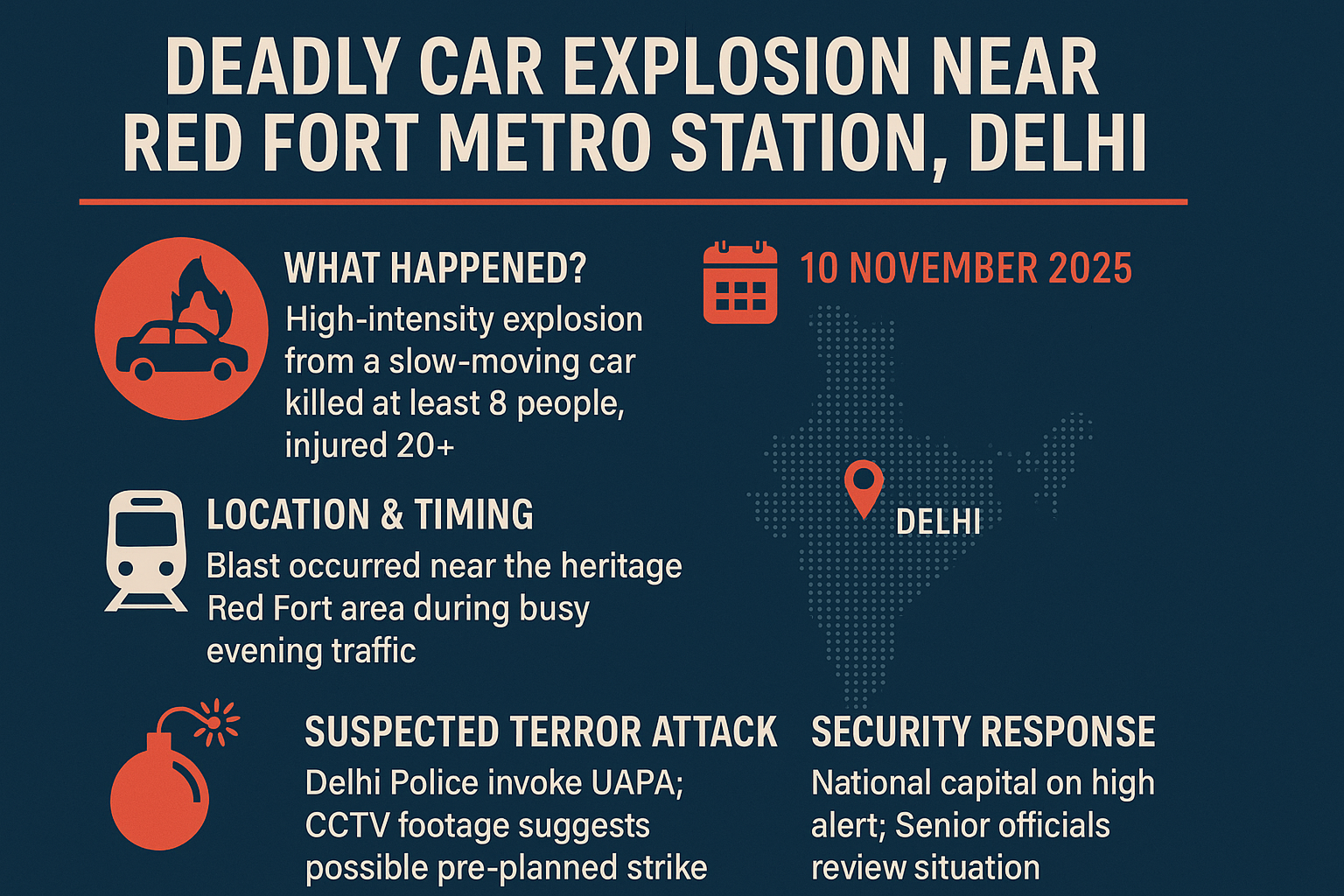 On November 10, 2025, a high-intensity explosion occurred near Red Fort Metro Station, Delhi, killing at least 13 people and injuring over 25 others.